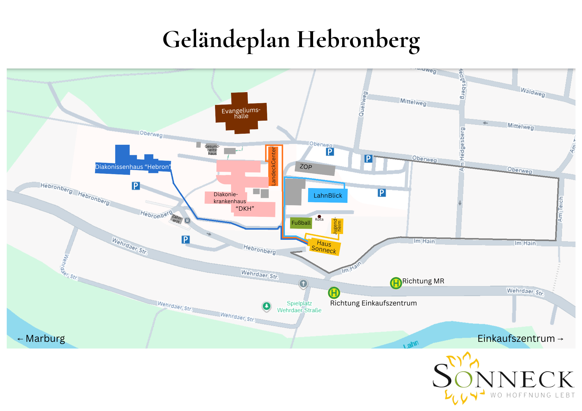 Mit der Bahn: Bis Marburg Hauptbahnhof; dann mit Buslinie 1 (Wehrda/Sachsenring) bis zur Haltestelle „Diakonie-Krankenhaus“ (Preis ca. 2,50 €); Taxistand vor dem Bahnhof (Preis bis Sonneck ca. 10,00 €).
